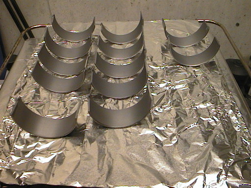 Rod bearings after coating with DFL-1 and baking them one hour in 300F.Työntötankojen laakerit käsitelty DFL-1 aineella ja uunin lämpöön