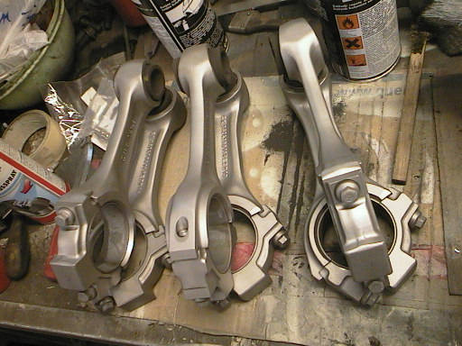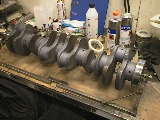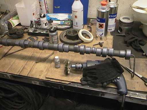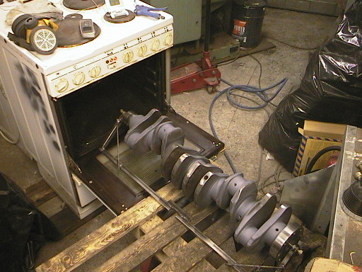 CamstandHow to spend Saturday perfectly;send wife and kids to visit relatives and lock yourself to garage!(well that was a accident...) What you are looking at 2 pics above is around nine hours straight job, first I made stands for cam and crank, then wash them with acetone, after that blasting with aluminum oxide, then acetone wash again, after that pre heat them in a oven to 122F, then I sprayed coating and then back to the oven, 300F for one hour.Pic is taken just before putting it in.