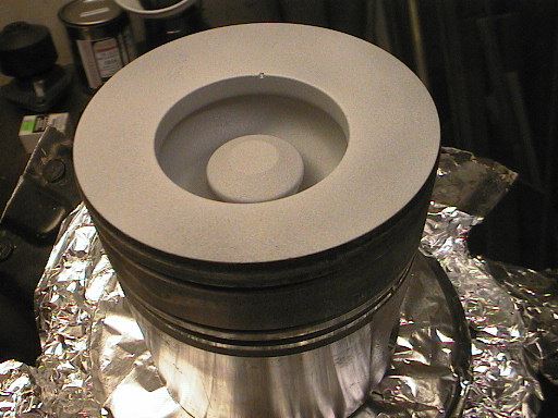 Practiced coating for an old piston, first try was too thick layer and it started to bubble off during baking, I blow it off and tried again with thinner layer and it turned out to be ok, pic is taken after oven treatment.Käsittelyn harjoitusta vanhalla männällä