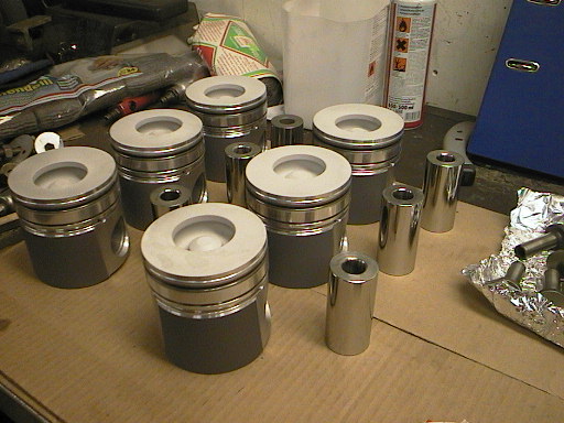 Summer 05Got rings installed to the pistons but break one oil ring from the #6, no worries, mailed to Tim and asked him to send one set of rings for me. So, all of them are in except the last one. Like some of you may remember ,the second ring is from Total Seal, nice to see how they work in street Cummins. Also got some of the front end components bolted back on, it's really nice to actually bolt something on, after tearing everything off and spreading them around the garage.