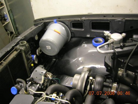 Last night bolted on with few bolts condenser and radiator just to get last two hose's done for the ac, this morning dropped them to a shop to get the other end done, need to trial fit them first to see where to cut the end of the ac compressor and the end of ac core. Also used a bucket as a air filter to see where to put BHAF, they should be about same size. Next on the line is to locate the oil filter base somewhere in the engine bay, to get easy access for it, most likely it's going to be between the air filter and radiator, there's a nice spot for it.