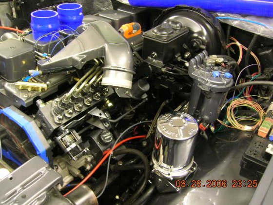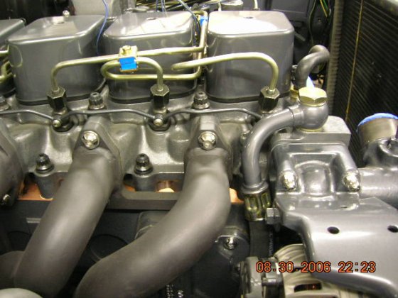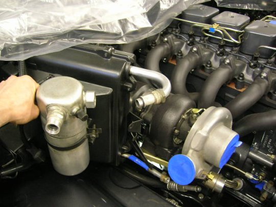 Couldn't use the original heater hose system and wanted to keep them out of sight much as possible, so, back to the hydraulic store again, found a banjo fitting where you could sold a desired tube, only problem is, on the Cummins head the treads are 1/2" NPT threads, therefore conical shape but 1/2" bolts for the hydraulic banjo fittings are with straight threads. The solution is to drive the bolt ones with 1/2" NPT threading head to make the bolt match the shape of NPT threads. Too bad they didn't had the bolt in stainless… Also, trial fit some hose's from turbo to the ic, they need to make the bend before ic to get enough room for BHAF filter.