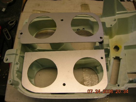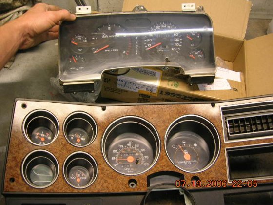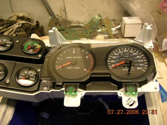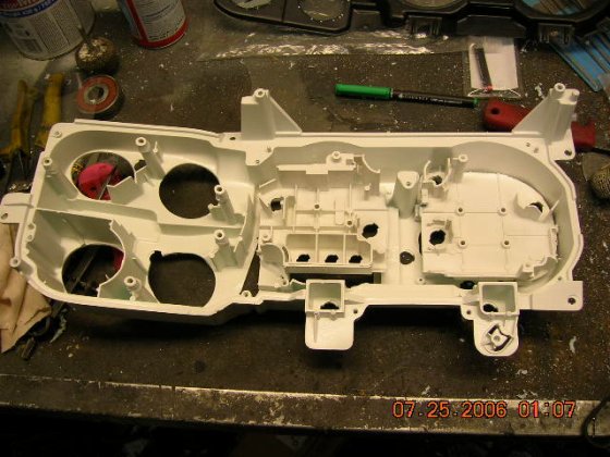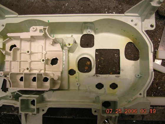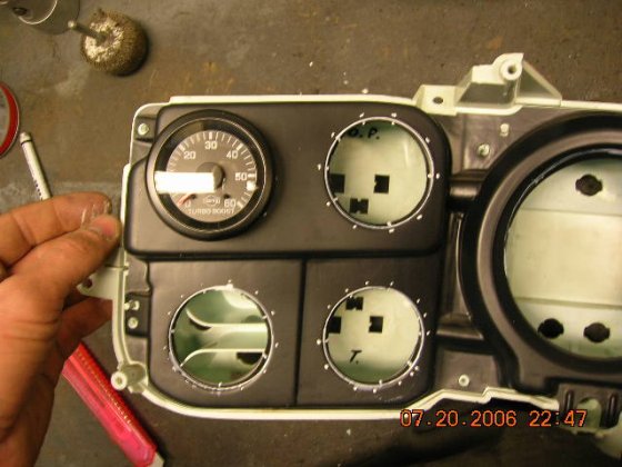 I use the front panel to check that the small meter holes are in center, marked with white marker and cut them a bit larger to accept the Isspro's. The plastic holds up the weight of the meter quite well but I'm going to stiffen up that are by cluing a thin aluminum plate behind it, don't want a squeaky dash board.