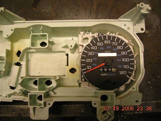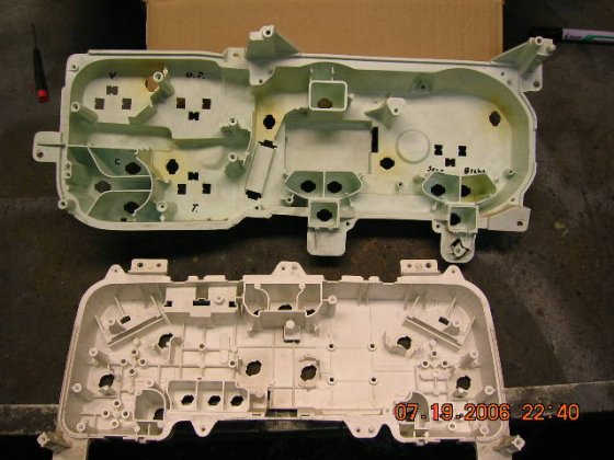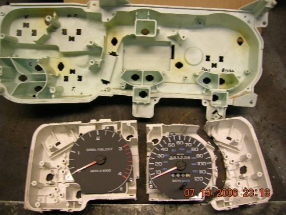 While waiting other parts, I decided to start the work with the gauges. The goal is to mate speed and rpm meters from -96 Dodge in to the burban unit and replace the four small ones with Isspro gauges. First I took everything off from both gauge holders and started to hack the dodge unit to get the base for the speedo and make it fit in the burban unit. That way the light bulbs are where they need to be and you could use meter own circuit foil to power it up. Although the foil is going to be a combination of Dodge and burban foils, but more of that later, ones I get that far.