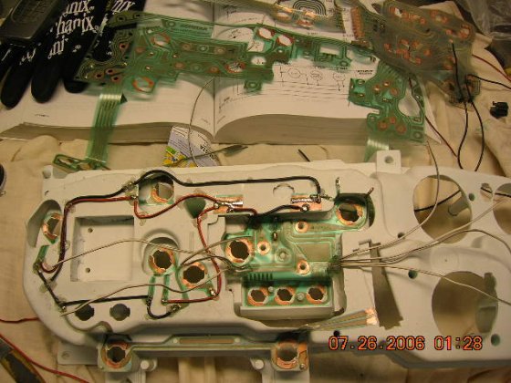 Started to work with the cluster wiring last evening. I cut a part what's needed to rpm from Dodge foil and solder wires for it, now they just need to connect to the right places. Wires to the bulbs are all done, I cut the contact parts to the bulbs from the Dodge foil and clued them on place, then wired them together. From the burban foil, I only used the part what's needed to turn signal indicators